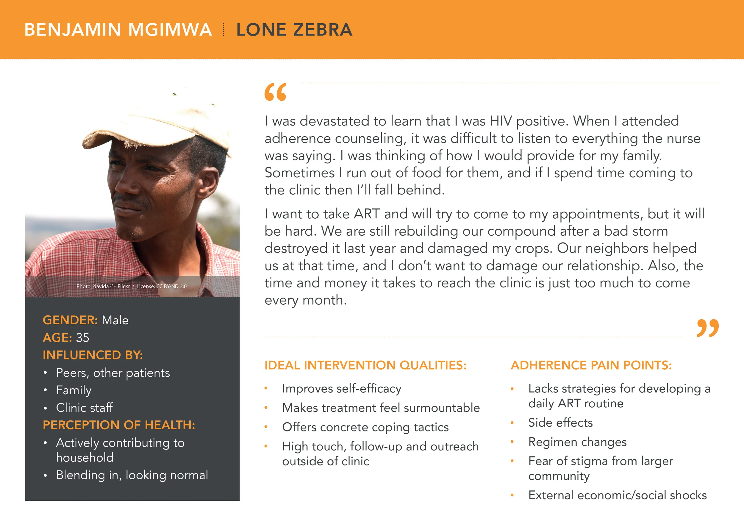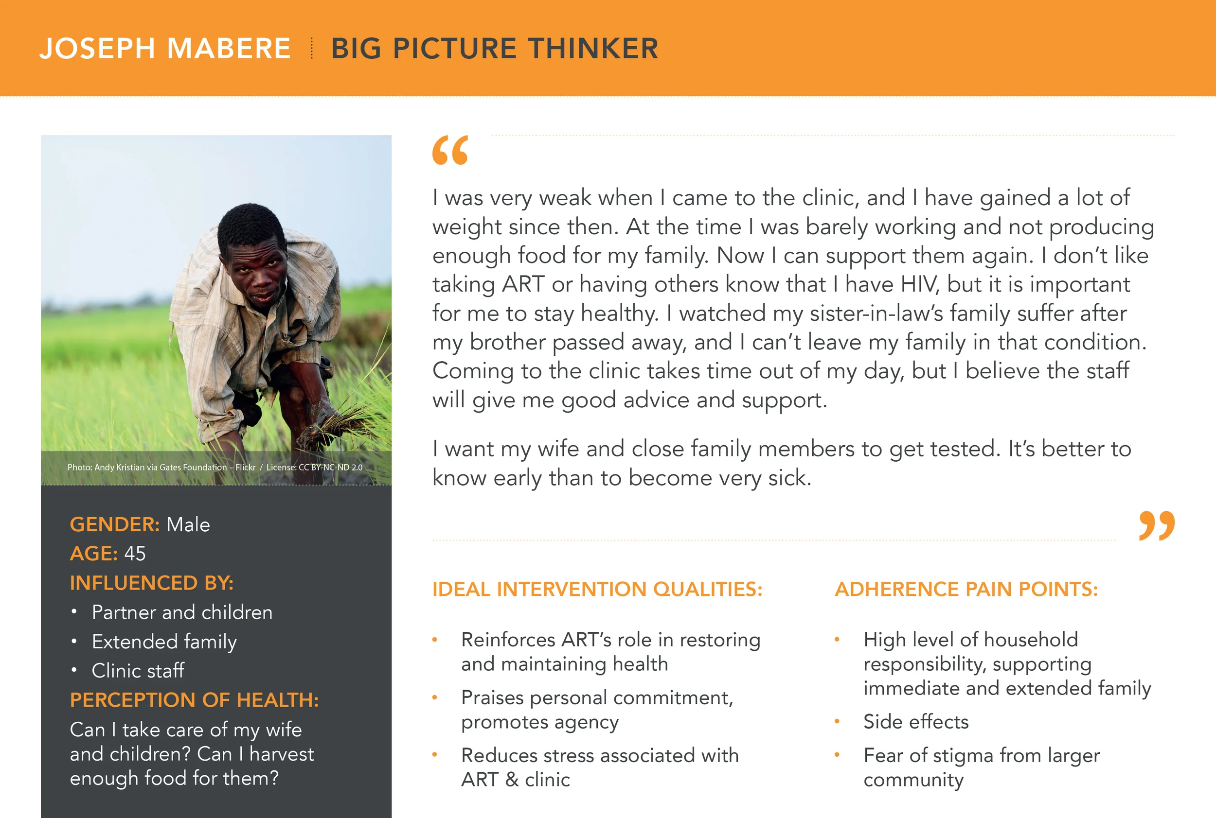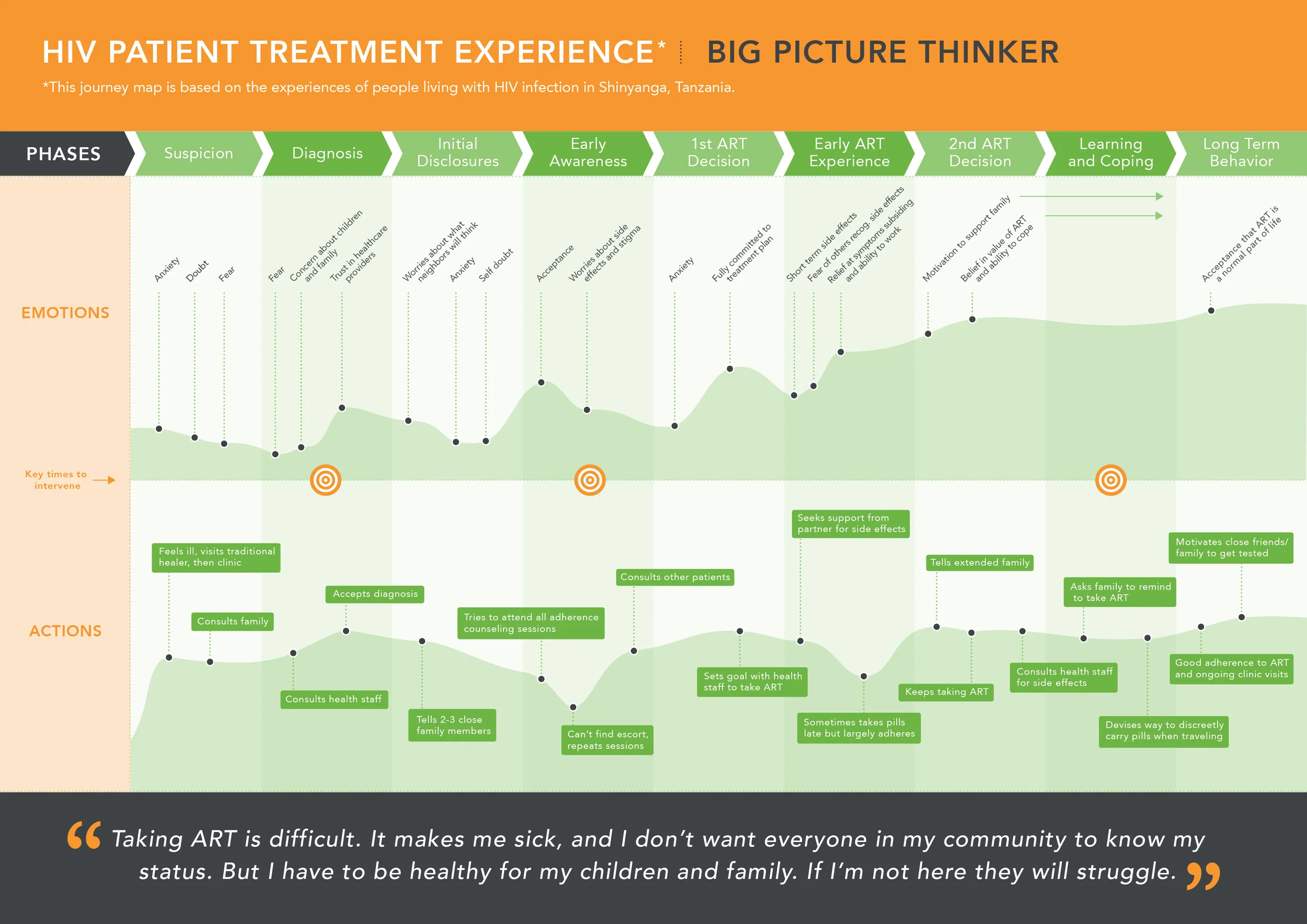 Patient Personas and Patient Journey Maps. The five patient personas presented here are fictional personifications of typical HIV-infected patients in Shinyanga, Tanzania. For example, "Big Picture Thinkers" are patients living with HIV who are strongly motivated to stay healthy by their personal and family goals such as supporting their spouses, caring for their children, etc. While they may encounter many obstacles, they have strong personal motivation to adhere to treatment. The corresponding patient journey maps represent important stages in the patient's experience with HIV treatment that influence adherence behavior. These maps can help program planners assess when and how to support each type of patient. (Click on images to view as full screen.)
