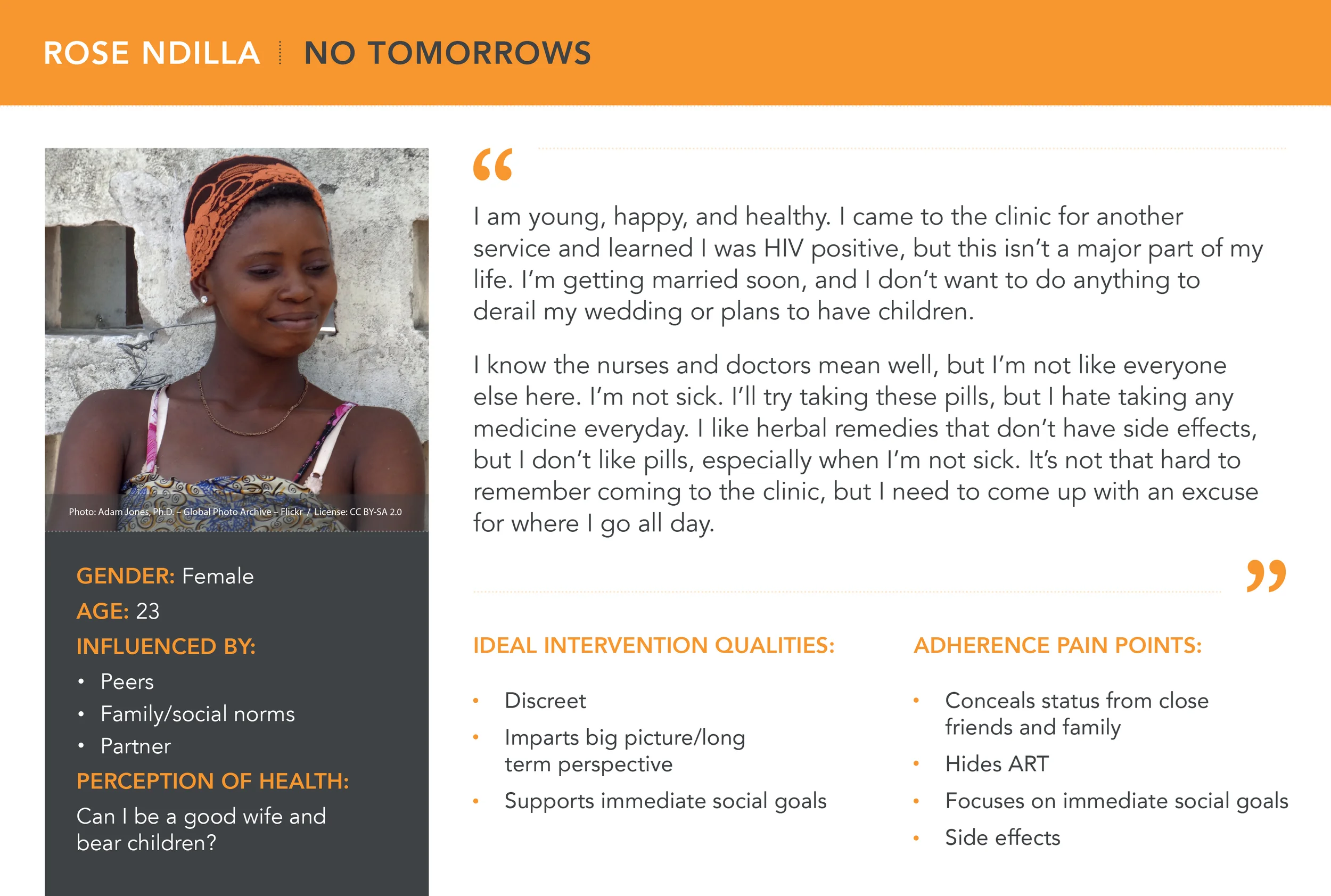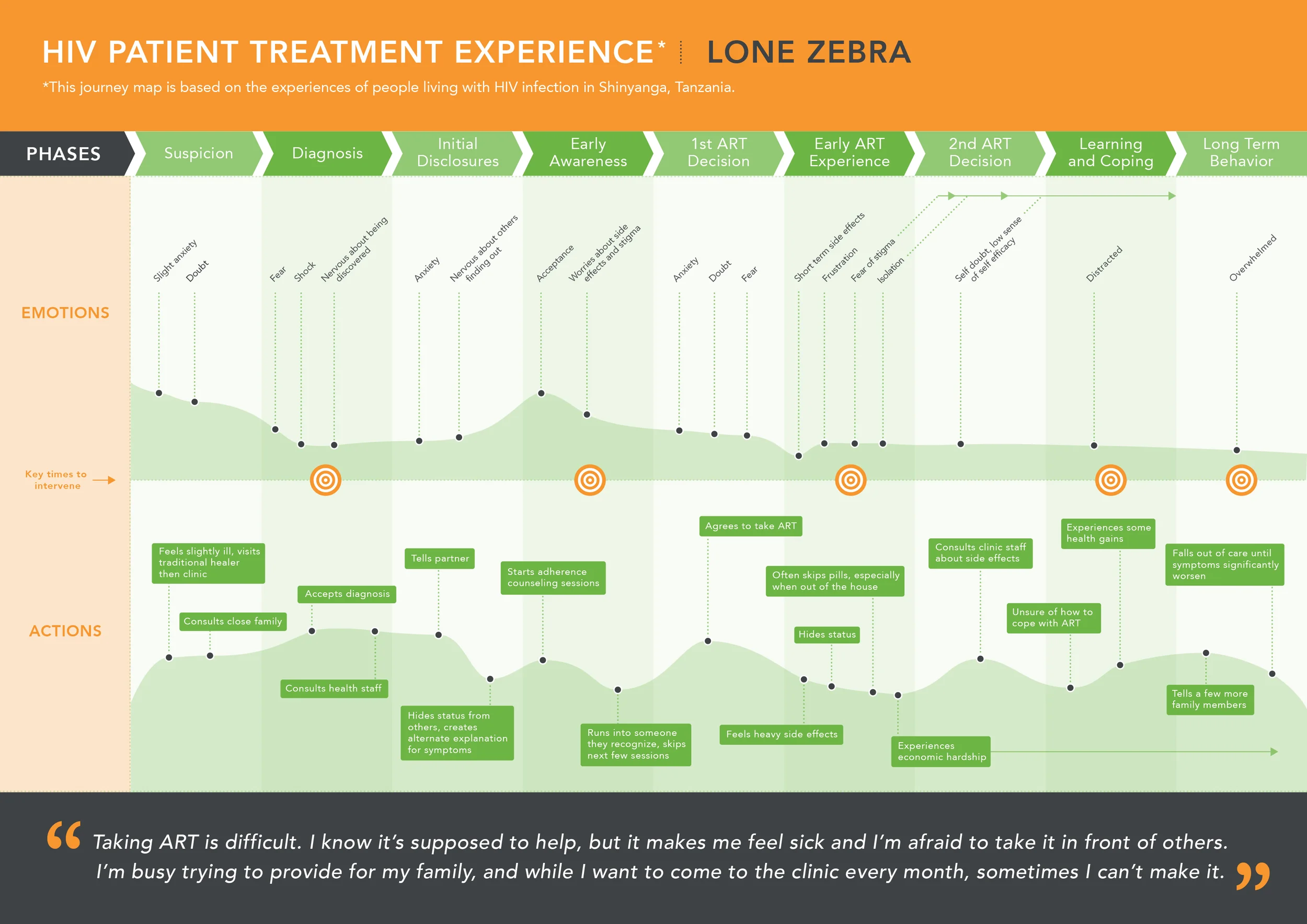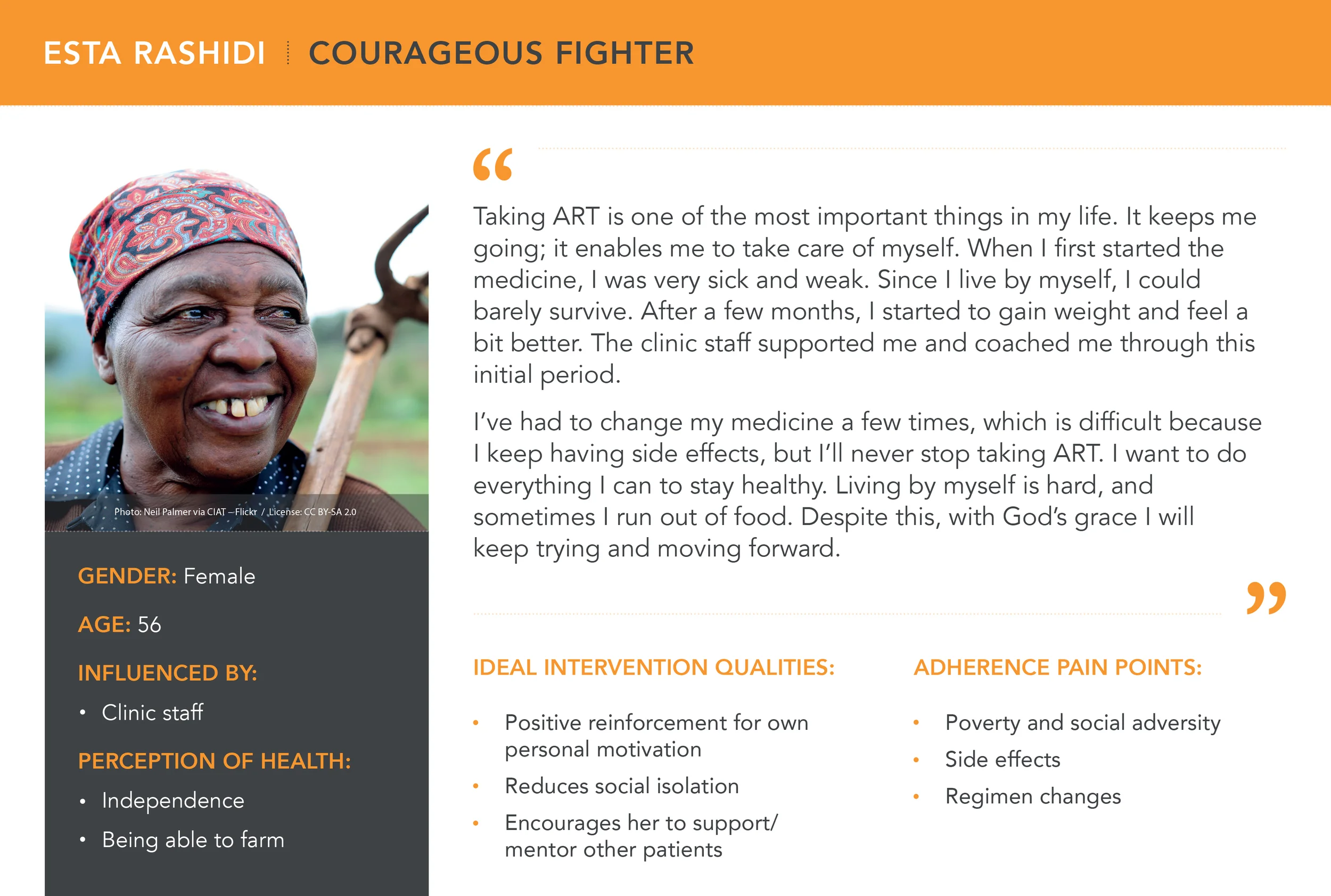 Patient Personas and Patient Journey Maps. The five patient personas presented here are fictional personifications of typical HIV-infected patients in Shinyanga, Tanzania. For example, "Big Picture Thinkers" are patients living with HIV who are strongly motivated to stay healthy by their personal and family goals such as supporting their spouses, caring for their children, etc. While they may encounter many obstacles, they have strong personal motivation to adhere to treatment. The corresponding patient journey maps represent important stages in the patient's experience with HIV treatment that influence adherence behavior. These maps can help program planners assess when and how to support each type of patient. (Click on images to view as full screen.)